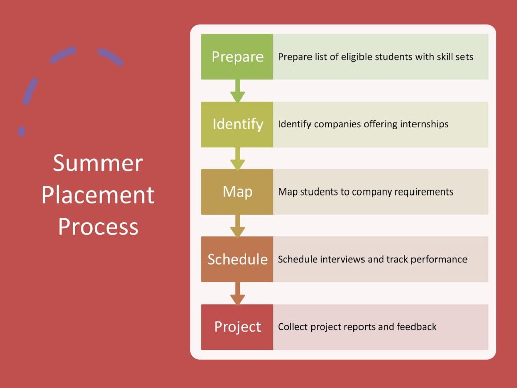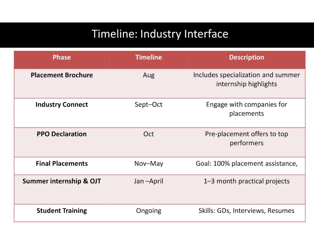 Summer Internship selection process starts from December and ends by mid-April. Internship in industry is for eight weeks in May and June.Similarly, the final placement season starts from July every year and ends by March.