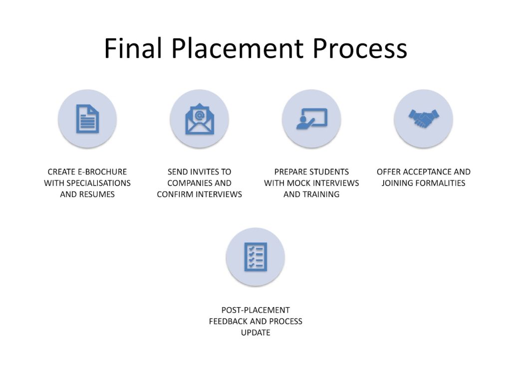 It begins with registration of students who need job placement from campus. Institute has Student’s Placement Policy, which is explain to students for better understanding and smooth functioning of entire process. CDC announces requirements of companies and invite response from students. Thereafter, pre-placement talks take place. Students apply for the company after going through the job descriptions as well requirements of the company. The resumes are sent to the company. Preliminary screening process and shortlisting candidates arranged by company. Thereafter, the selection process on campus/off campus takes place which includes Written tests, Group discussion, Personal interview, as per the need. Further, the results are announced and document submission as per requirement completed by students. Company issue offers to selected students and joining schedule.