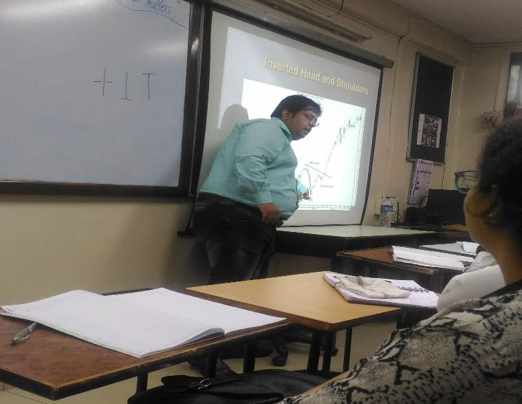 A guest lecture was conducted on 15th September, 2018 from 4.30 pm to 7.30 pm for MMS Finance Sem 3 students for the topic of technical analysis. The resource person for the same was Mr. Mayank Abhishek, Relationship Manager – TickerPlant Ltd. The objective of the session was to give an overview on the basic concepts of Technical Analysis. Line chart, Bar chart, Japanese candle stick charts were explained. Basic concepts like DOW theory, trend lines, averages, price patterns etc were covered in the lecture. The guest lecture was well received by the students.
